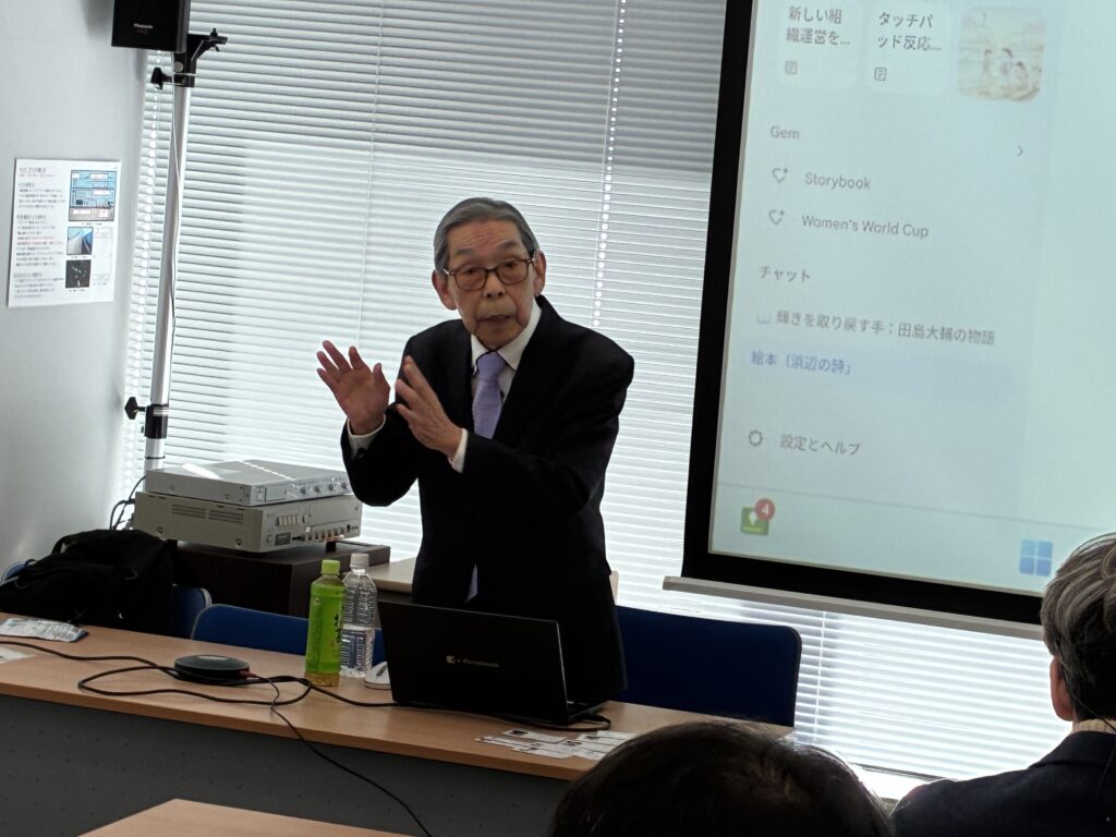 2026年1月の定例会では、岩崎理事長の会社の先輩でもある、人間力大学校校長 天明茂様(宮城大学名誉教授、公認会計士)をお招きし、「AI出版で日本を変える」と題したご講演をいただきました。