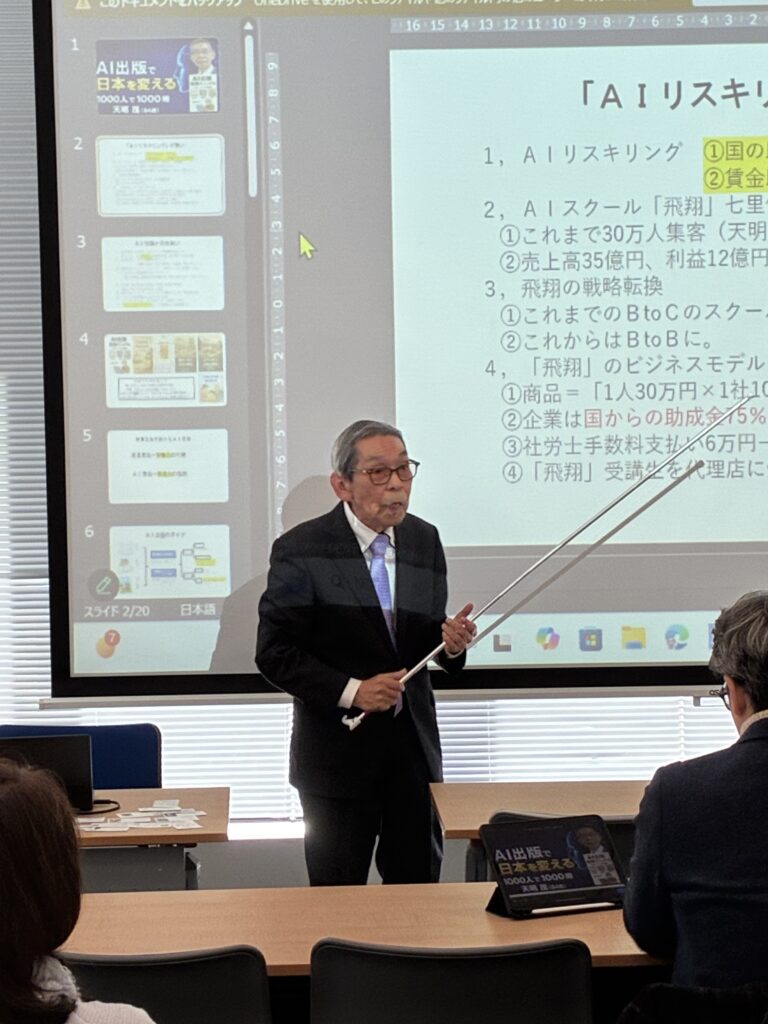 また、AIスクール「飛翔」の実績や、BtoBへの戦略転換、国の助成金制度を活用した企業向け講座の展開など、AIリスキリングと出版を組み合わせた新たな人材育成・企業支援の可能性についても具体的に解説されました。